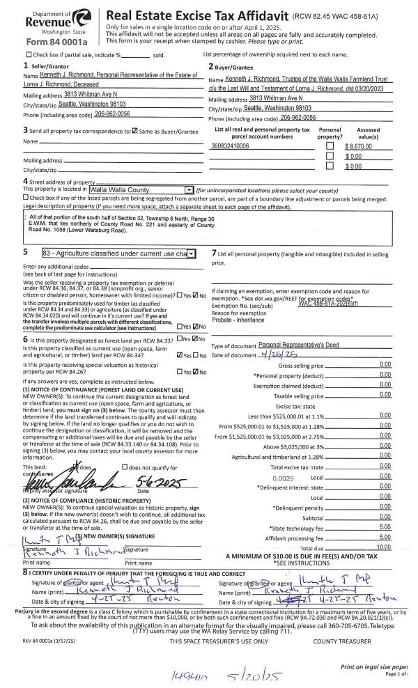 | 1 | 05/20/2025 | DPR | DEED OF PERSONAL REPRESENTATIVE | RICHMOND LORNA JEAN | WALLA WALLA FARMLAND TRUST | | | | 149410 | 2025-02778 |