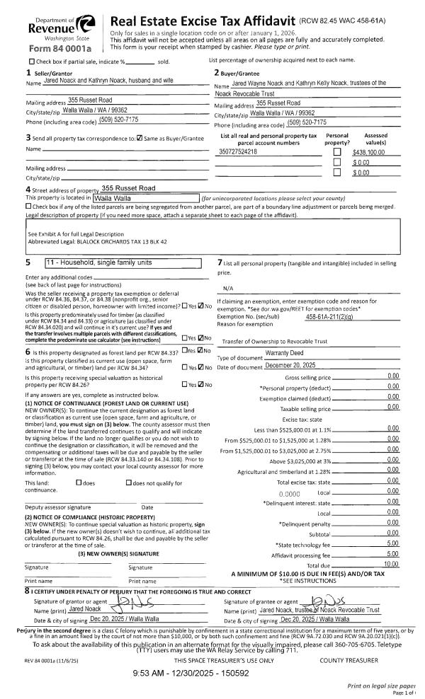 | 1 | 12/31/2025 | WARRANTY D | WARRANTY DEED | NOACK JARED & KATHRYN | NOACK REVOCABLE TRUST | | | | 0 | 2025-08047 |