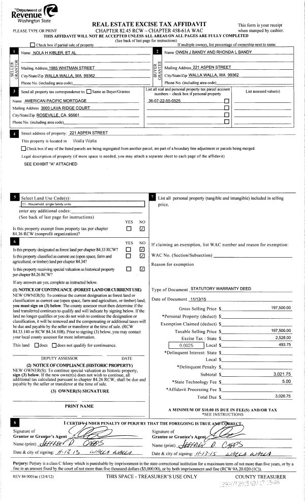 | 3 | 11/17/2015 | SWD | STATUTORY WARRANTY DEED | KIBLER NOLA H ET AL | BANDY OWEN J & RHONDA L | | | $197,500.00 | 129207 | 2015-09992 |