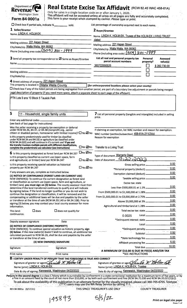 | 1 | 04/22/2022 | WARRANTY D | WARRANTY DEED | HOLM-EK LINDA K | HOLM EK LIVING TRUST | | | $0.00 | 143893 | 2022-03851 |