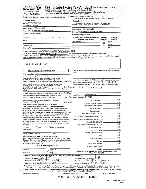 | 1 | 05/14/2021 | QCD | QUIT CLAIM DEED | WOOLEVER DAVID & SHERRI | WOOLEVER DAVID & SHERRI A | | | $0.00 | 141652 | 2021-06425 |