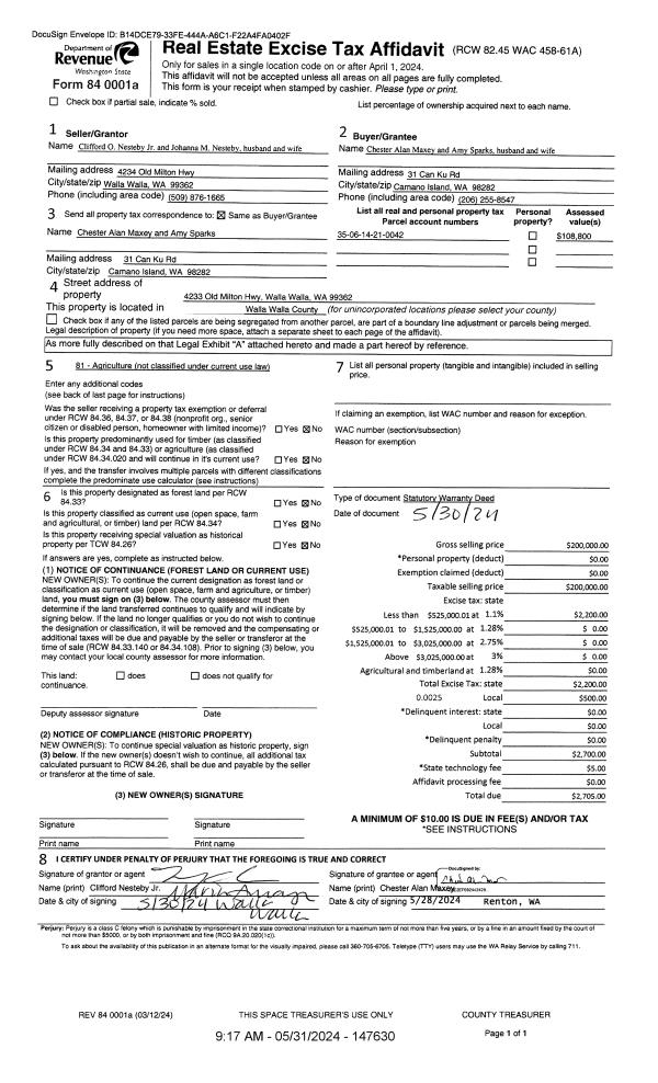 | 1 | 05/31/2024 | SWD | STATUTORY WARRANTY DEED | NESTEBY CLIFFORD JR & JOHANNA M | MAXEY CHESTER ALAN & AMY SPARKS | | | $200,000.00 | 147630 | 2024-02875 |