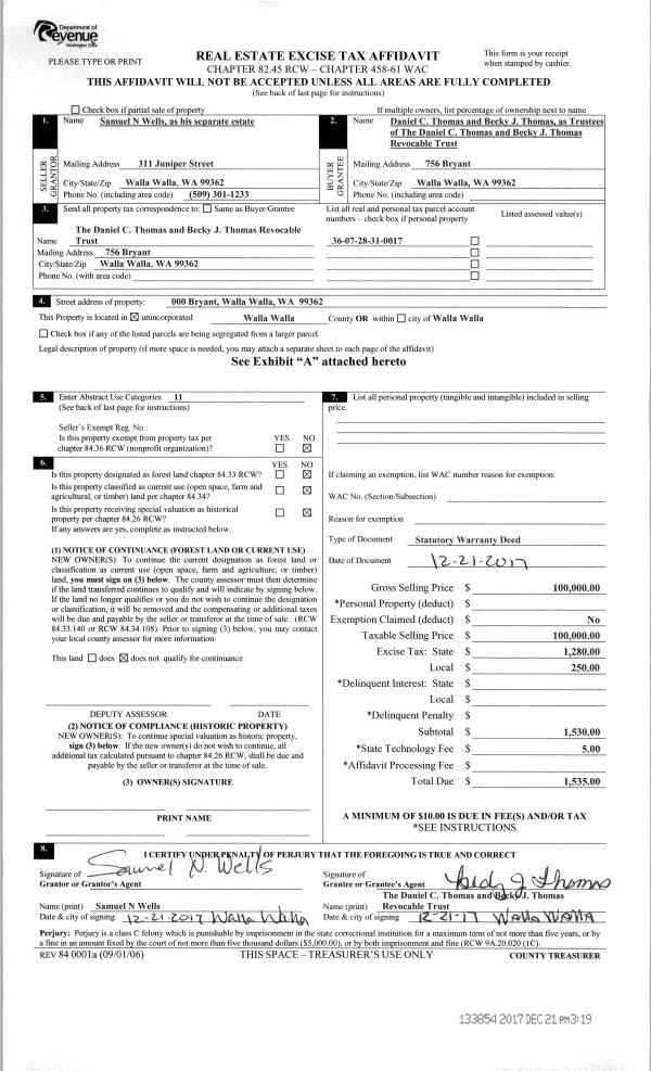| 4 | 12/21/2017 | SWD | STATUTORY WARRANTY DEED | WELLS SAMUEL N | THOMAS THE DANIEL C THOMAS & BECKY J REVOCABLE TRUST | | | $100,000.00 | 133854 | 2017-10299 |