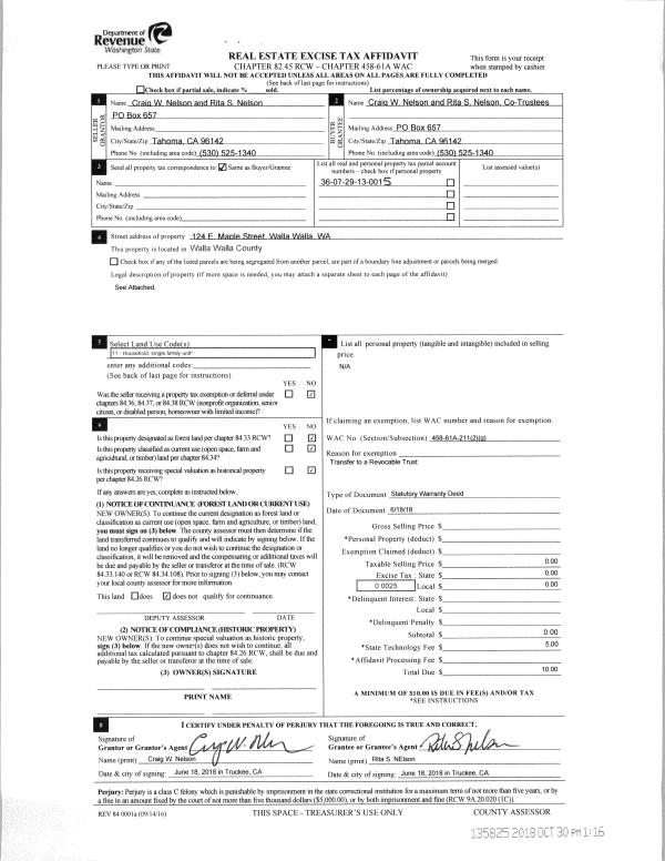 | 1 | 06/18/2018 | SWD | STATUTORY WARRANTY DEED | NELSON CRAIG W & RITA S | NELSON FAMILY TRUST | | | $0.00 | 135825 | 2018-08978 |