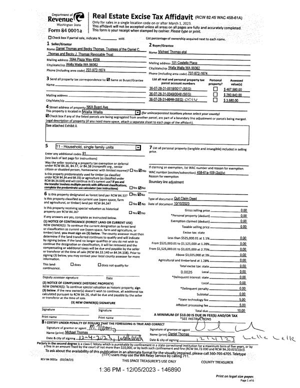 | 2 | 12/05/2023 | QCD | QUIT CLAIM DEED | THOMAS DANIEL C THOMAS & BECKY J REVOCABLE TRUST | THOMAS MICHAEL & HOLLY ET AL | | | | 146890 | 2023-07027 |