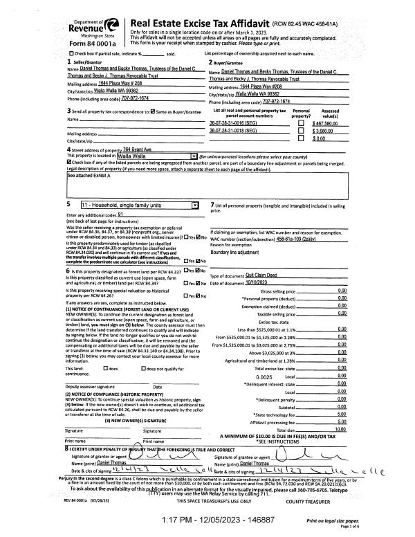 | 2 | 12/05/2023 | QCD | QUIT CLAIM DEED | THOMAS DANIEL C THOMAS & BECKY J REVOCABLE TRUST | THOMAS DANIEL C THOMAS & BECKY J REVOCABLE TRUST | | | | 146887 | 2023-07024 |