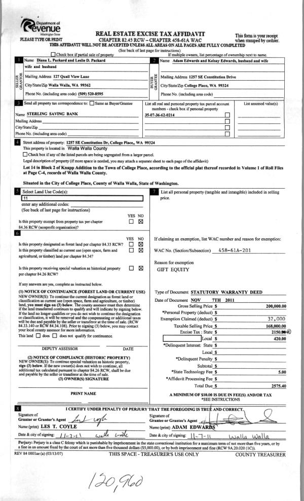 | 2 | 11/09/2011 | WARRANTY D | WARRANTY DEED | PACKARD, LESLIE D & DIANA L | EDWARDS, ADAM & KELSAY | | | $200,000.00 | 120960 | 2011-08833 |