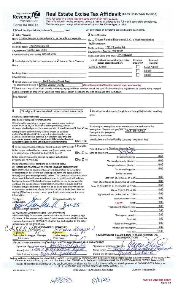 | 1 | 08/12/2025 | WARRANTY D | WARRANTY DEED | KREGGER LORALEE | KREGGER FARMING ENTERPRISES LLC | | | | 149853 | 2025-04768 |