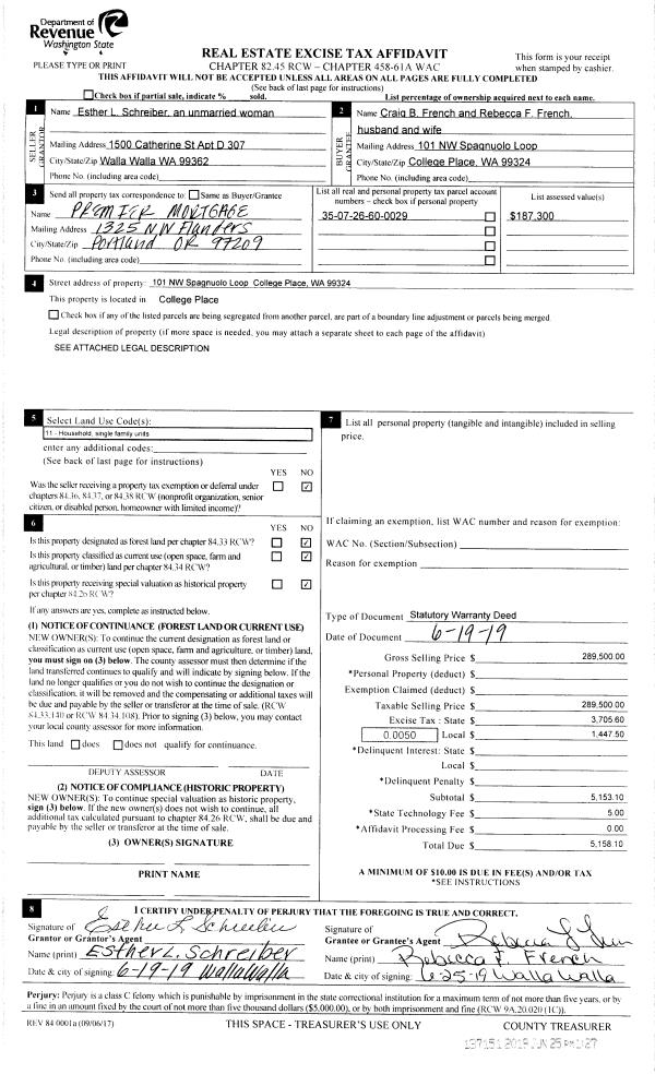 | 2 | 06/25/2019 | SWD | STATUTORY WARRANTY DEED | SCHREIBER ESTHER L | FRENCH REBECCA F & CRAIG B | | | $289,500.00 | 137151 | 2019-04496 |