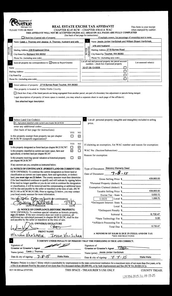 | 1 | 07/09/2015 | SWD | STATUTORY WARRANTY DEED | THONNEY CALEB J & JESSICA A | VANSCHEIK WILLIAM SHAWN & JESSIE JORDAN | | | $439,900.00 | 128356 | 2015-05865 |