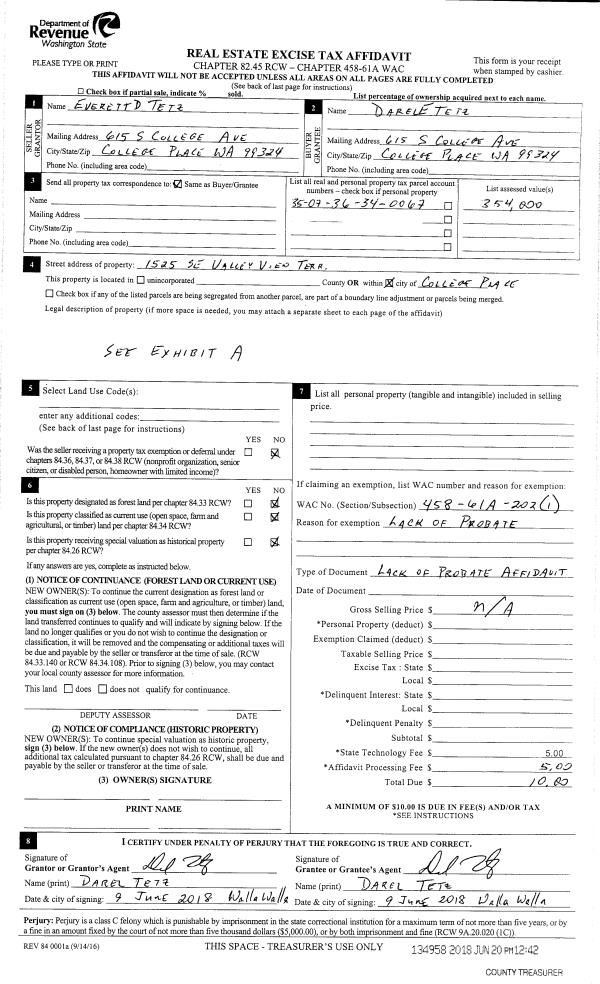 | 3 | 06/09/2018 | LOPA | LACK OF PROBATE AFFIDAVIT | TETZ EVERETT D LIFE ESTATE | TETZ DAREL E | | | $0.00 | 134958 | 2018-04944 |