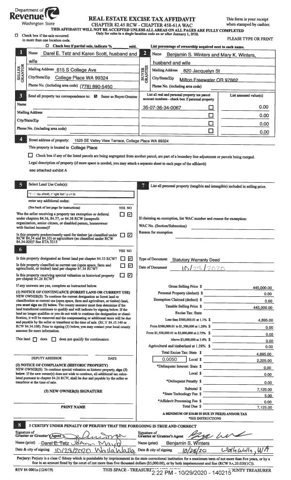 | 2 | 10/29/2020 | SWD | STATUTORY WARRANTY DEED | TETZ DAREL E | WINTERS BENJAMIN S & MARY K | | | $445,000.00 | 140215 | 2020-11304 |