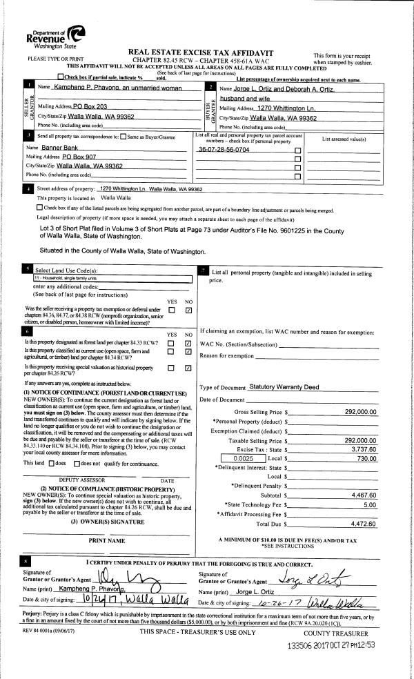 | 1 | 10/27/2017 | SWD | STATUTORY WARRANTY DEED | PHAVONG KHAMPHENG | ORTIZ JORGE L & DEBORAH A | | | $292,000.00 | 133506 | 2017-08620 |