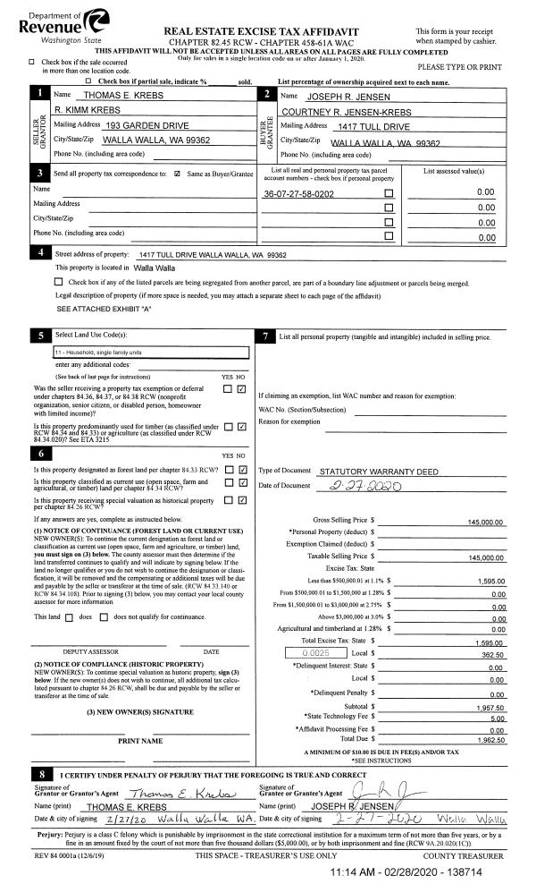 | 1 | 02/28/2020 | SWD | STATUTORY WARRANTY DEED | KREBS THOMAS E & R KIMM | JENSEN JOSEPH R & COURTNEY R JENSEN-KREBS | | | $145,000.00 | 138714 | 2020-01886 |