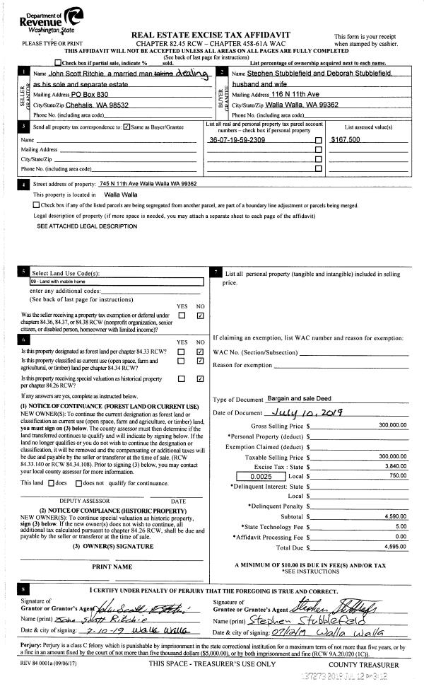 | 1 | 07/12/2019 | BARGAIN & | BARGAIN & SALE DEED | RITCHIE JOHN SCOTT | STUBBLEFIELD STEPHEN & DEBORAH | | | $300,000.00 | 137273 | 2019-04994 |
