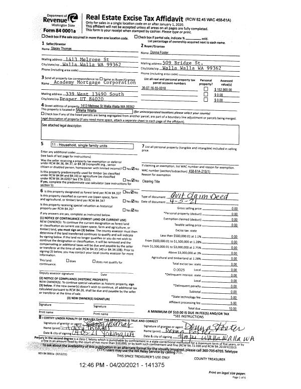 | 2 | 04/05/2021 | QCD | QUIT CLAIM DEED | THOMAS STACEY 50% | FOSTER DONNA S | | | $0.00 | 141375 | 2021-04606 |
