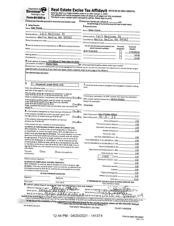 | 3 | 04/05/2021 | LOPA | LACK OF PROBATE AFFIDAVIT | THOMAS DYLAN & STACEY | THOMAS STACEY 50% | | | $0.00 | 141374 | 2021-04605 |