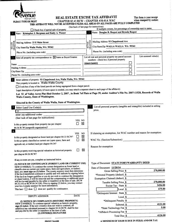 | 1 | 11/21/2014 | SWD | STATUTORY WARRANTY DEED | BORGMAN KRISTOPHER J | ROQUET DOUGLAS R & BRENDA | | | $270,000.00 | 126986 | 2014-08464 |