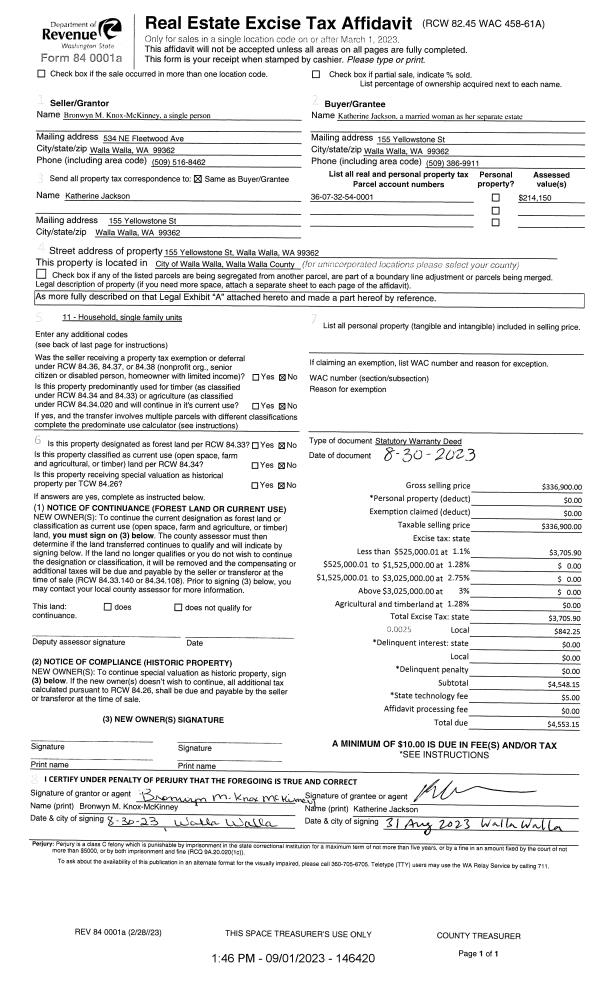 | 2 | 09/01/2023 | SWD | STATUTORY WARRANTY DEED | KNOX-MCKINNEY BRONWYN M | JACKSON KATHERINE | | | $336,900.00 | 146420 | 2023-05119 |