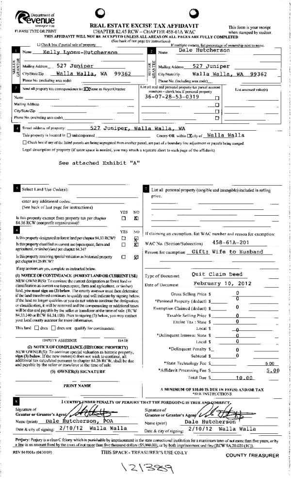 | 4 | 02/13/2012 | QCD | QUIT CLAIM DEED | LYONS-HUTCHERSON, KELLY ANN | HUTCHERSON, DALE | | | | 121389 | 2012-01233 |