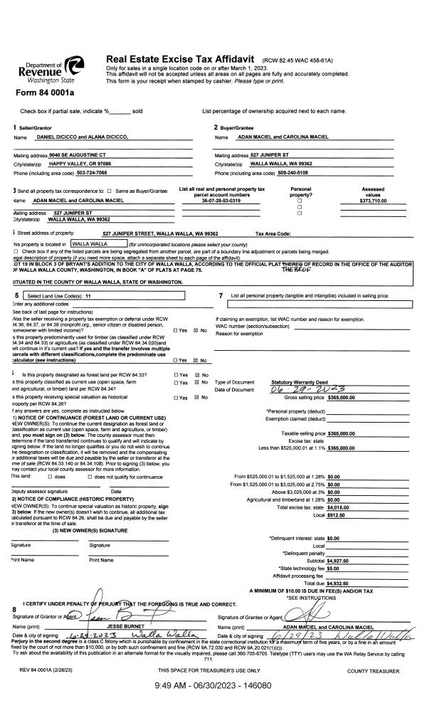 | 1 | 06/30/2023 | SWD | STATUTORY WARRANTY DEED | DICICCO DANIEL & ALANA | MACIEL ADAN & CAROLINA | | | $365,000.00 | 146080 | 2023-03675 |