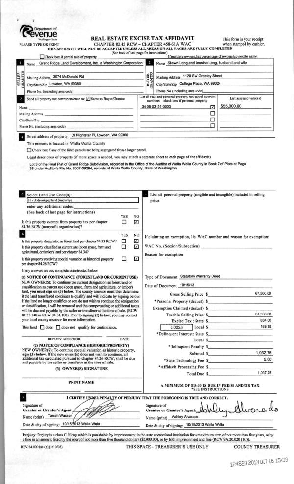 | 3 | 10/16/2013 | WARRANTY D | WARRANTY DEED | GRAND RIDGE LAND DEVELOPMENT I | LONG, SHAWN & JESSICA | | | $67,500.00 | 124828 | 2013-10415 |