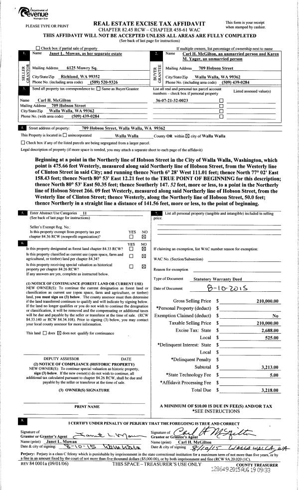 | 3 | 08/19/2015 | SWD | STATUTORY WARRANTY DEED | MOWAN JANET | MCGILTON CARL H & KAREN M YAGER | | | $210,000.00 | 128649 | 2015-07249 |