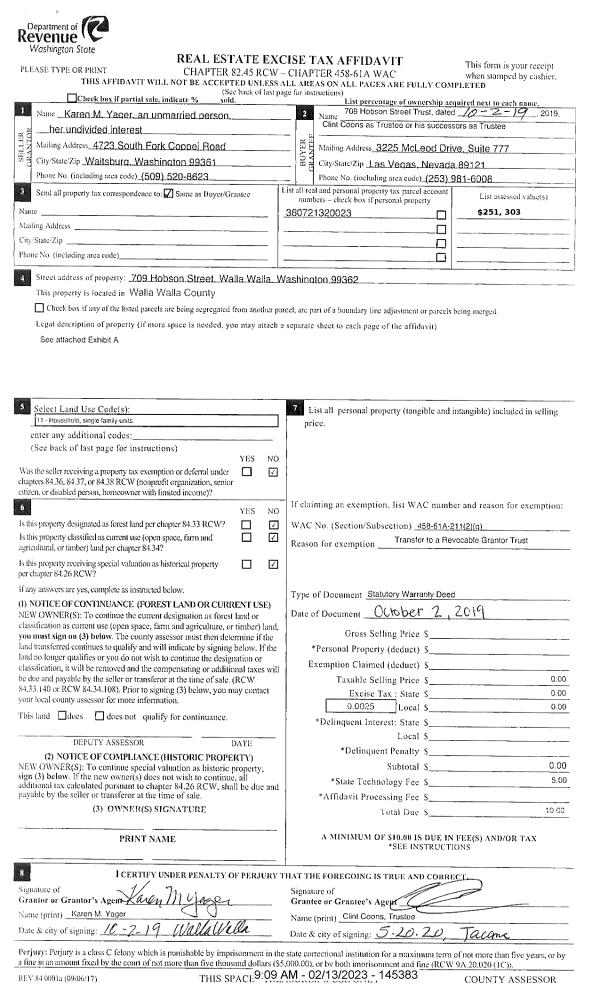 | 1 | 03/15/2023 | SWD | STATUTORY WARRANTY DEED | MCGILTON CARL H & KAREN M YAGER | MCGILTON CARL H AND 709 HOBSON STREET TRUST | | | | 145383 | 2023-01338 |