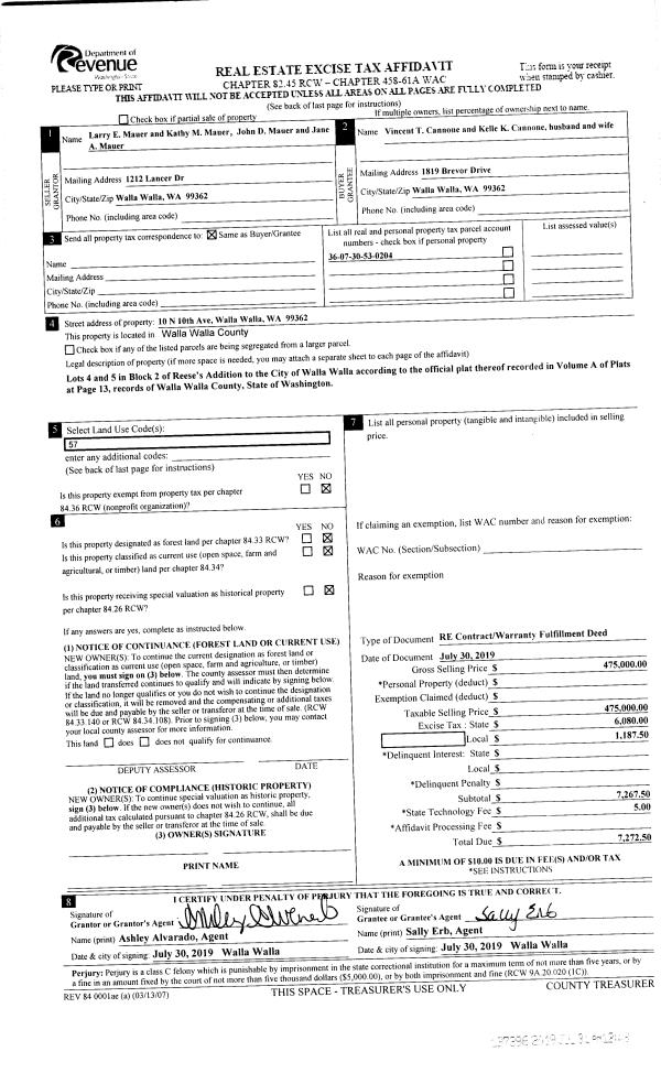 | 1 | 07/31/2019 | REAL ESTAT | REAL ESTATE CONTRACT | MAUER LARRY E & KATHY M | CANNONE VINCENT T & KELLE K | | | $475,000.00 | 137396 | 2019-05634 |