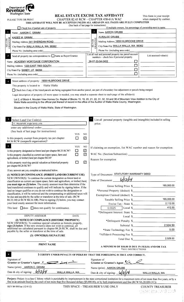 | 1 | 06/13/2014 | SWD | STATUTORY WARRANTY DEED | GRIMM AARON C & KADEE M | GRUBB AARON & AURALEE | | | $165,000.00 | 126060 | 2014-04071 |