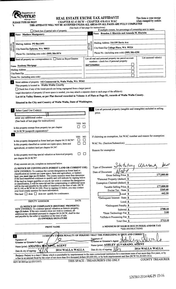 | 1 | 08/18/2014 | SWD | STATUTORY WARRANTY DEED | MONTGOMERY MATTHEW | HINRICHS BRANDON J & AMANDA M | | | $177,000.00 | 126560 | 2014-06377 |