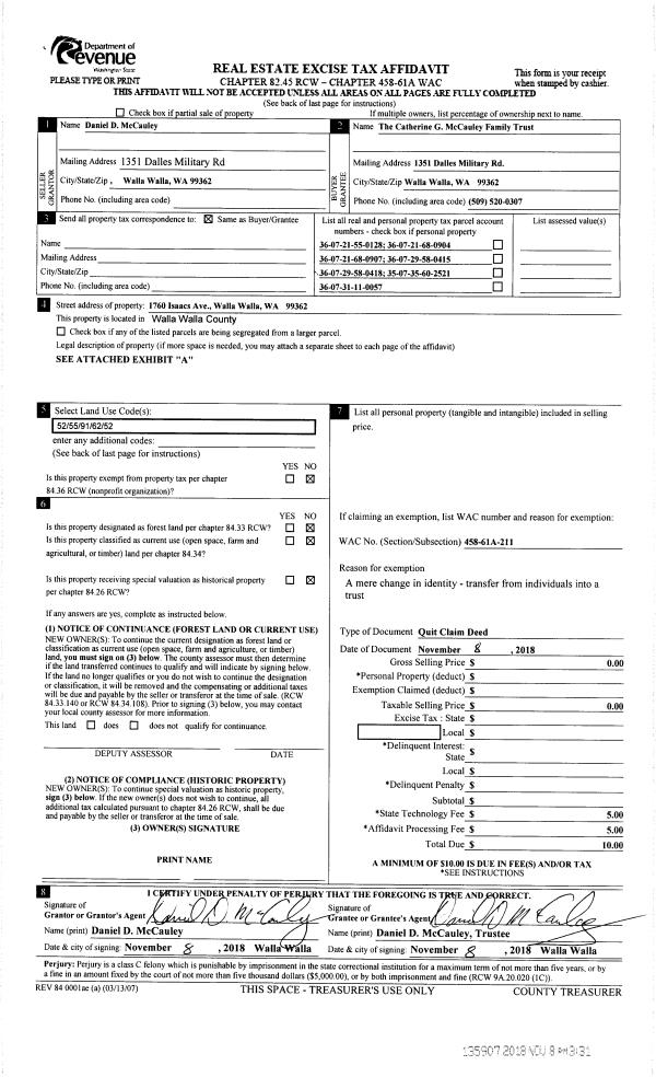 | 1 | 11/08/2018 | QCD | QUIT CLAIM DEED | MC CAULEY DANIEL & CATHERINE | MC CAULEY CATHERINE G FAMILY TRUST | | | $0.00 | 135907 | 2018-09300 |