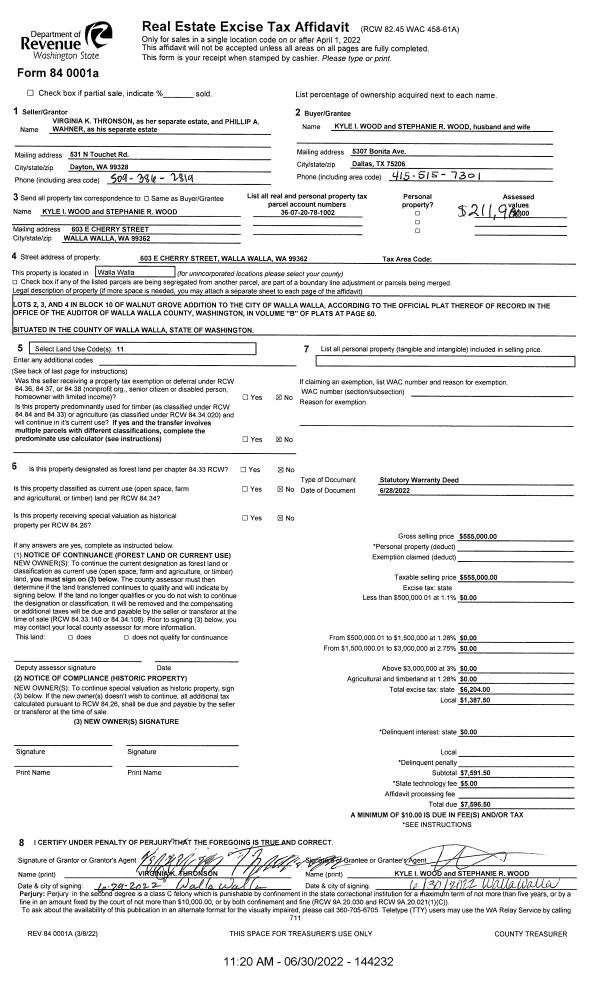 | 3 | 06/30/2022 | SWD | STATUTORY WARRANTY DEED | THRONSON VIRGINIA K LIFE ESTATE | WOOD KYLE I & STEPHANIE R | | | $555,000.00 | 144232 | 2022-05539 |