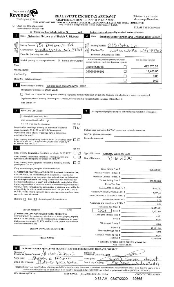 | 1 | 08/07/2020 | SWD | STATUTORY WARRANTY DEED | NICOARA SEBASTIAN & SHELAH | HEINRICH STEPHEN SCOTT & CHRISTINE BELL | | 2-PARCELS | $855,000.00 | 139665 | 2020-07737 |