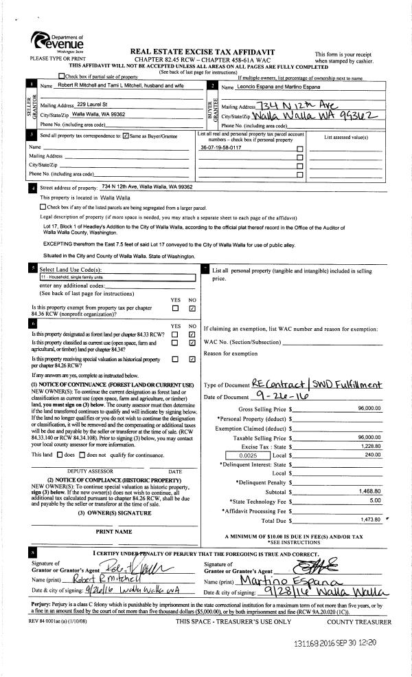 | 1 | 09/30/2016 | REAL ESTAT | REAL ESTATE CONTRACT | MITCHELL ROBERT R & TAMI L | ESPANA LEONCIO | | | $96,000.00 | 131168 | 2016-08080 |