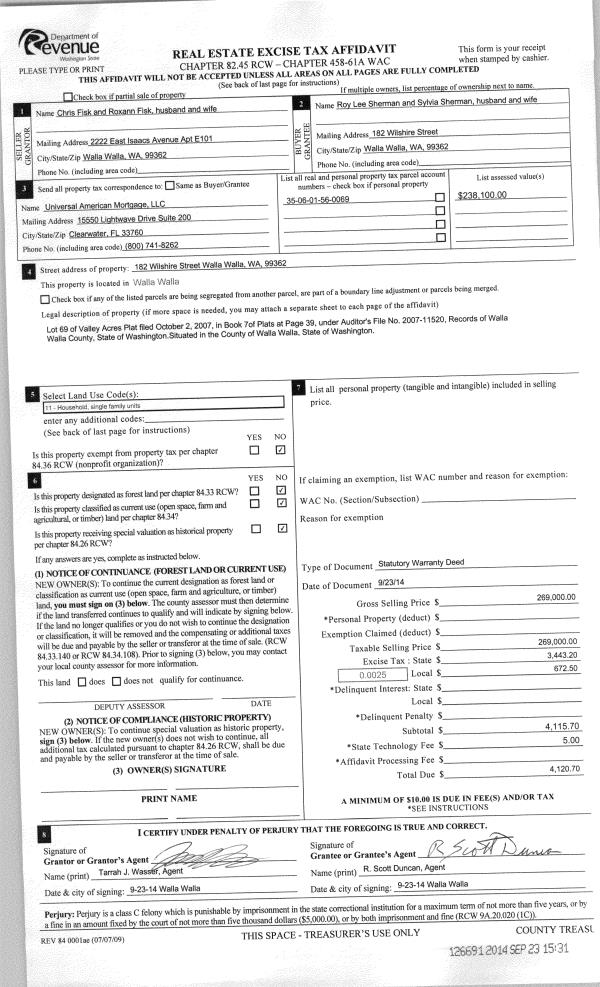 | 3 | 09/23/2014 | SWD | STATUTORY WARRANTY DEED | FISK CHRIS & ROXANN | SHERMAN ROY LEE & SYLVIA | | | $269,000.00 | 126691 | 2014-06985 |