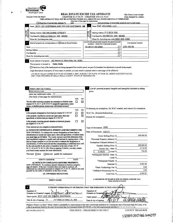 | 2 | 08/01/2017 | SWD | STATUTORY WARRANTY DEED | SHERMAN ROY LEE & SYLVIA | PHF HOLDINGS LLC | | | $290,000.00 | 132889 | 2017-05873 |