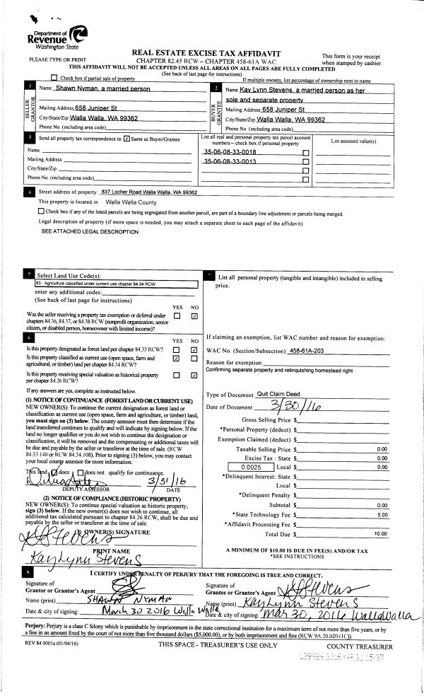 | 3 | 03/31/2016 | QCD | QUIT CLAIM DEED | NYMAN SHAWN | STEVENS KAY LYNN | | | | 129926 | 2016-02368 |