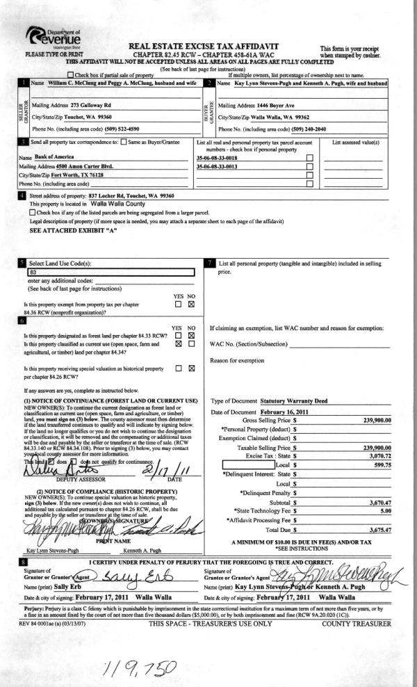 | 5 | 02/17/2011 | WARRANTY D | WARRANTY DEED | MC CLUNG WILLIAM C & PEGGY A | PUGH KENNETH A | | | | 119750 | 2011-01559 |