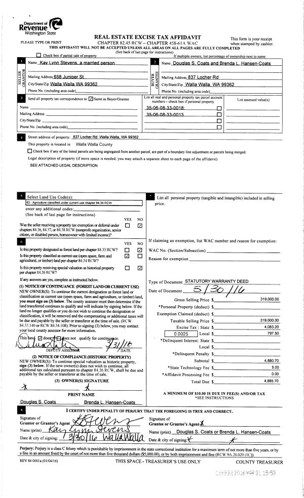 | 2 | 03/31/2016 | SWD | STATUTORY WARRANTY DEED | STEVENS KAY LYNN | COATS DOUGLAS S & BRENDA L HANSEN-COATS | | 2-PARCELS | $319,000.00 | 129932 | 2016-02369 |