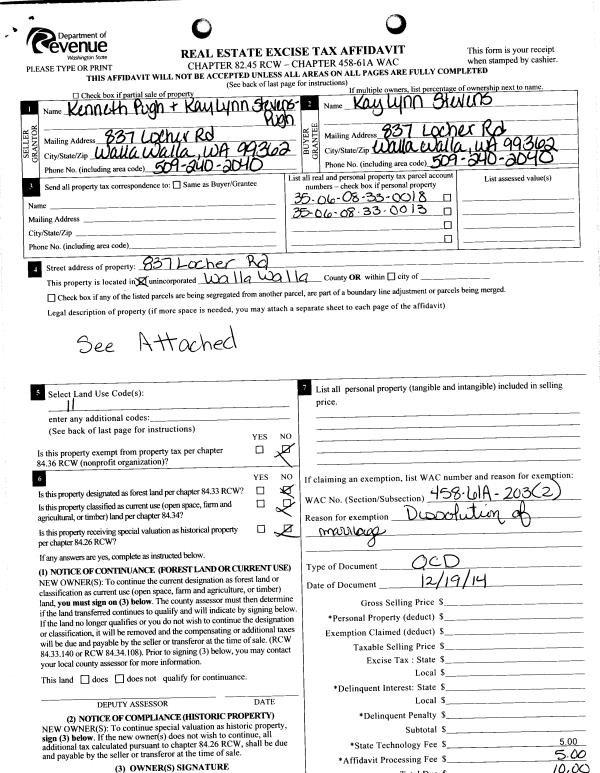 | 4 | 12/23/2014 | QCD | QUIT CLAIM DEED | PUGH KENNETH A | STEVENS KAY LYNN | | 2-PARCELS | | 127167 | 2014-09312 |