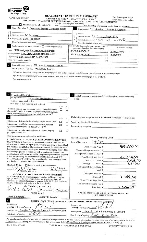 | 1 | 03/08/2019 | SWD | STATUTORY WARRANTY DEED | COATS DOUGLAS S & BRENDA L HANSEN-COATS | LOCKARD JARED S & LINDSAY E | | 2-PARCELS | $435,000.00 | 136500 | 2019-01538 |