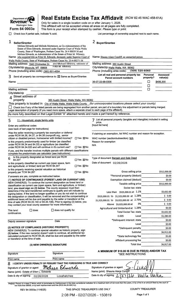 | Mailing Address: | 360 AUSTIN ST WALLA WALLA, WA 99362 | % Ownership: | 100.0000000000% |