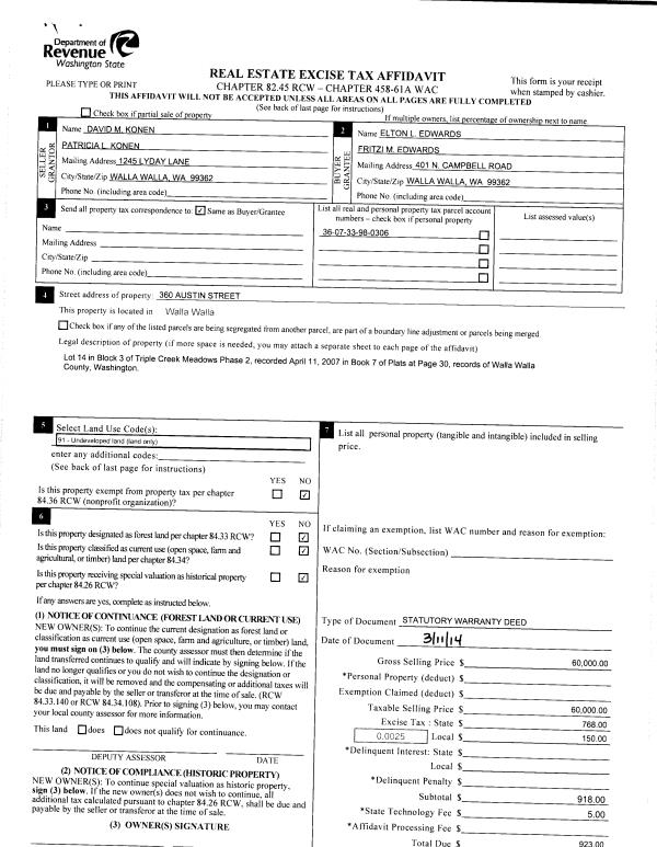 | 3 | 03/12/2014 | SWD | STATUTORY WARRANTY DEED | KONEN DAVID M & PATRICIA L | EDWARDS ELTON L & FRITZI M | | | $60,000.00 | 125546 | 2014-01653 |