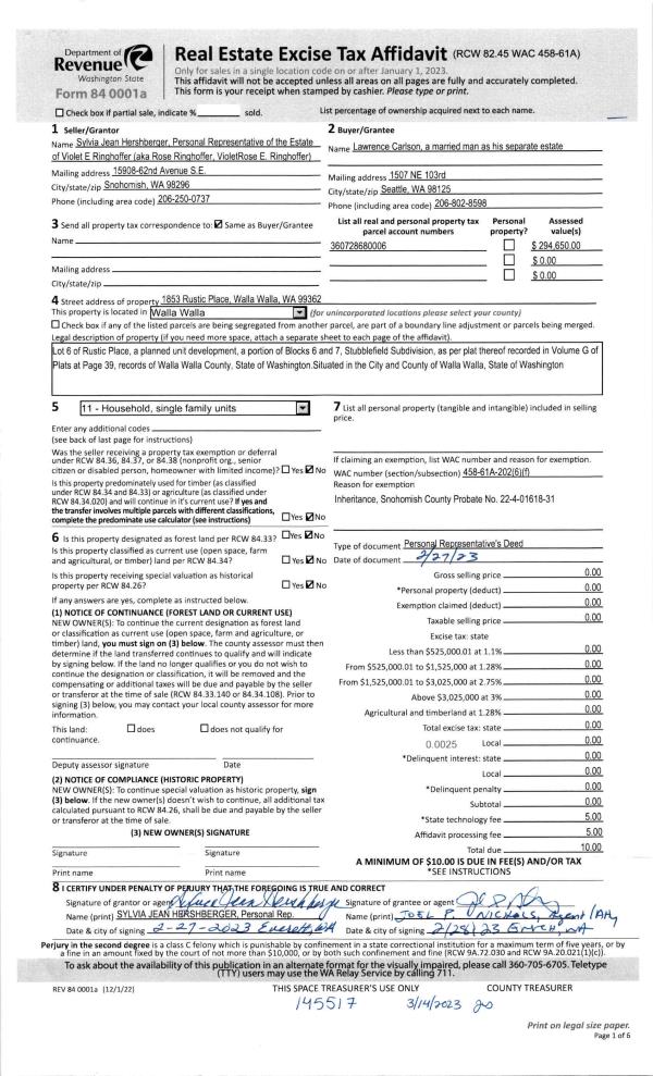 | 1 | 03/14/2023 | DPR | DEED OF PERSONAL REPRESENTATIVE | RINGHOFFER ROSE | CARLSON LAWRENCE | | | | 145517 | 2023-01317 |