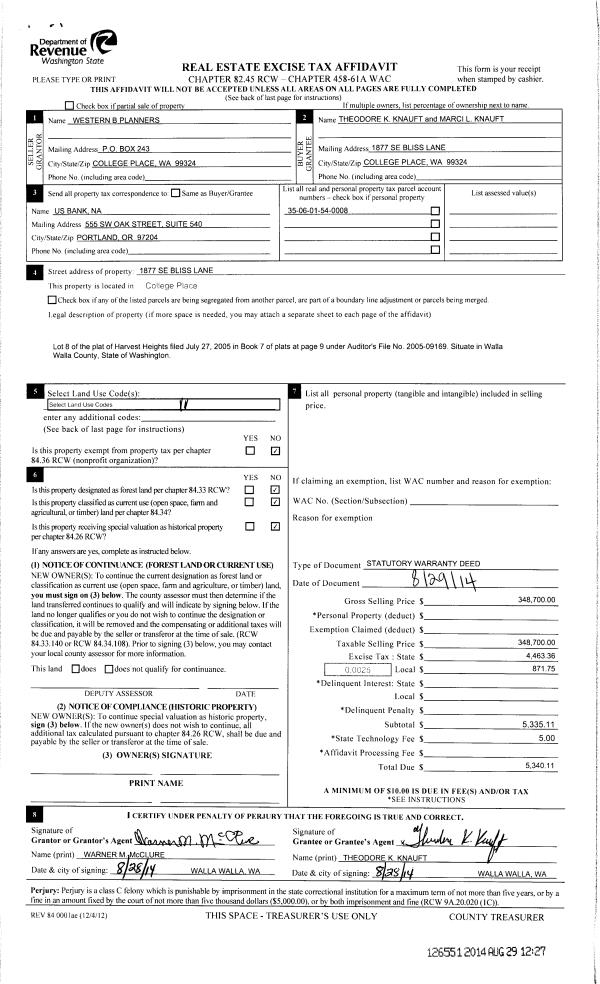 | 1 | 08/28/2014 | SWD | STATUTORY WARRANTY DEED | WESTERN B PLANNERS | KNAUFT THEODORE K & MARCI L | | | $348,700.00 | 126551 | 2014-06367 |