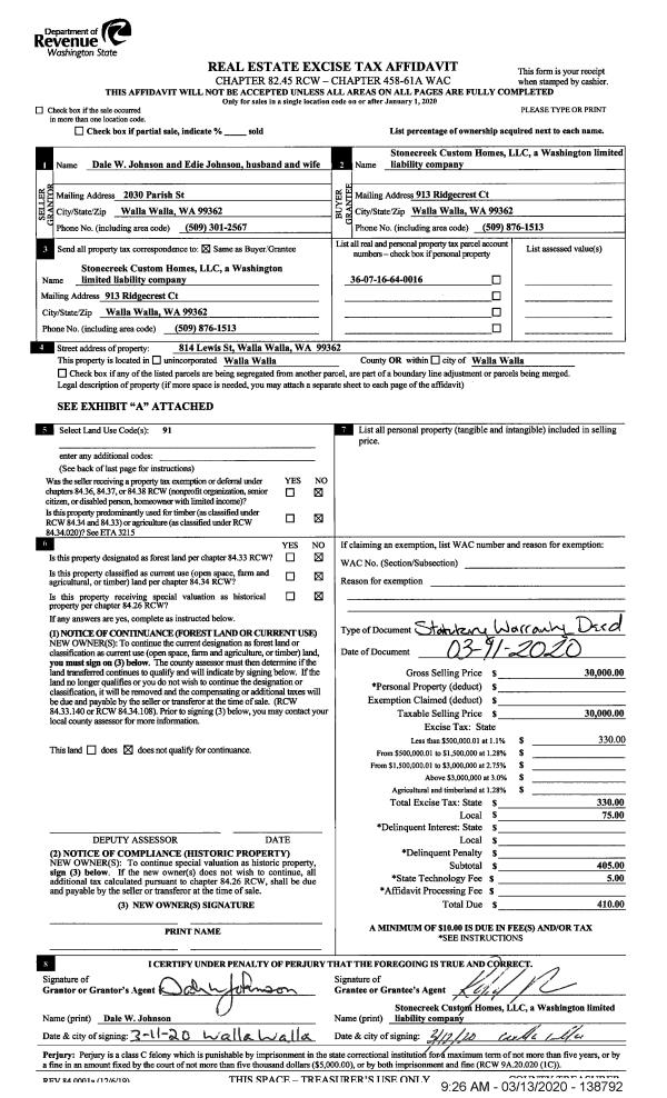 | 2 | 03/13/2020 | SWD | STATUTORY WARRANTY DEED | JOHNSON DALE W & EDIE | STONE CREEK CUSTOM HOMES LLC | | | $30,000.00 | 138792 | 2020-02325 |