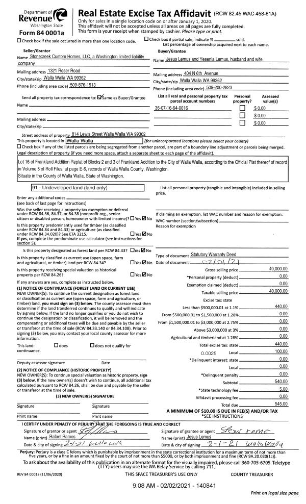 | 1 | 02/02/2021 | SWD | STATUTORY WARRANTY DEED | STONE CREEK CUSTOM HOMES LLC | LEMUS JESUS & YESENIA | | | $40,000.00 | 140841 | 2021-01269 |
