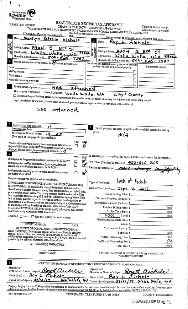 | 3 | 09/12/2017 | LOPA | LACK OF PROBATE AFFIDAVIT | AICHELE ROY L & PATRICIA AND SCOTT AICHELE AND | AICHELE ROY L ET AL | | | $0.00 | 133208 | 2017-07182 |