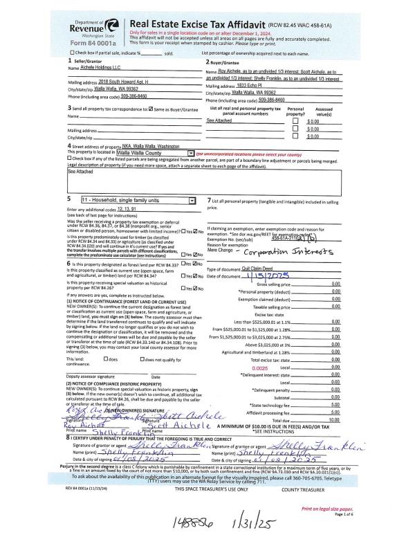 | 2 | 01/31/2025 | QCD | QUIT CLAIM DEED | AICHELE HOLDINGS LLC | AICHELE ROY L & SCOTT AICHELE | | | | 148856 | 2025-00502 |